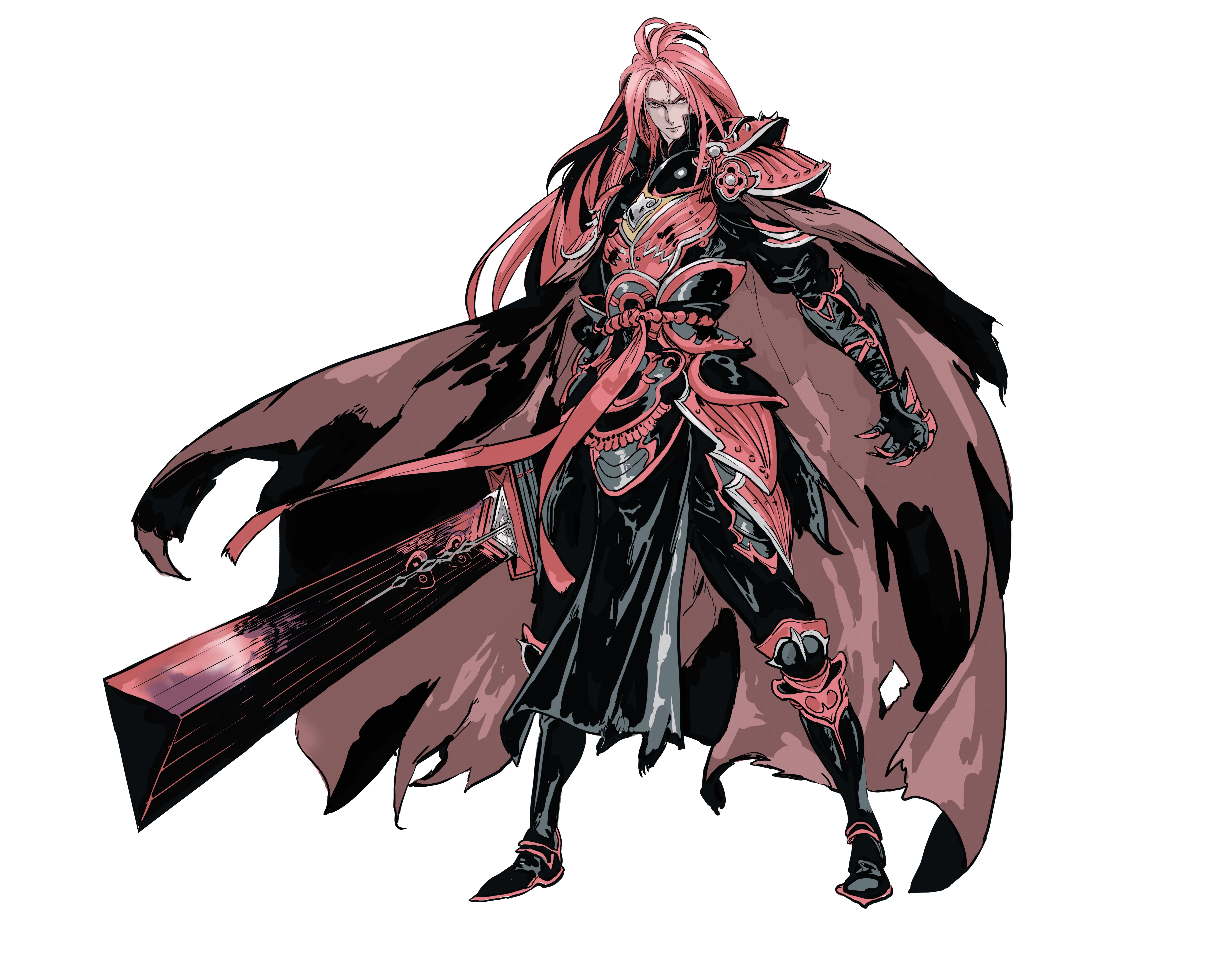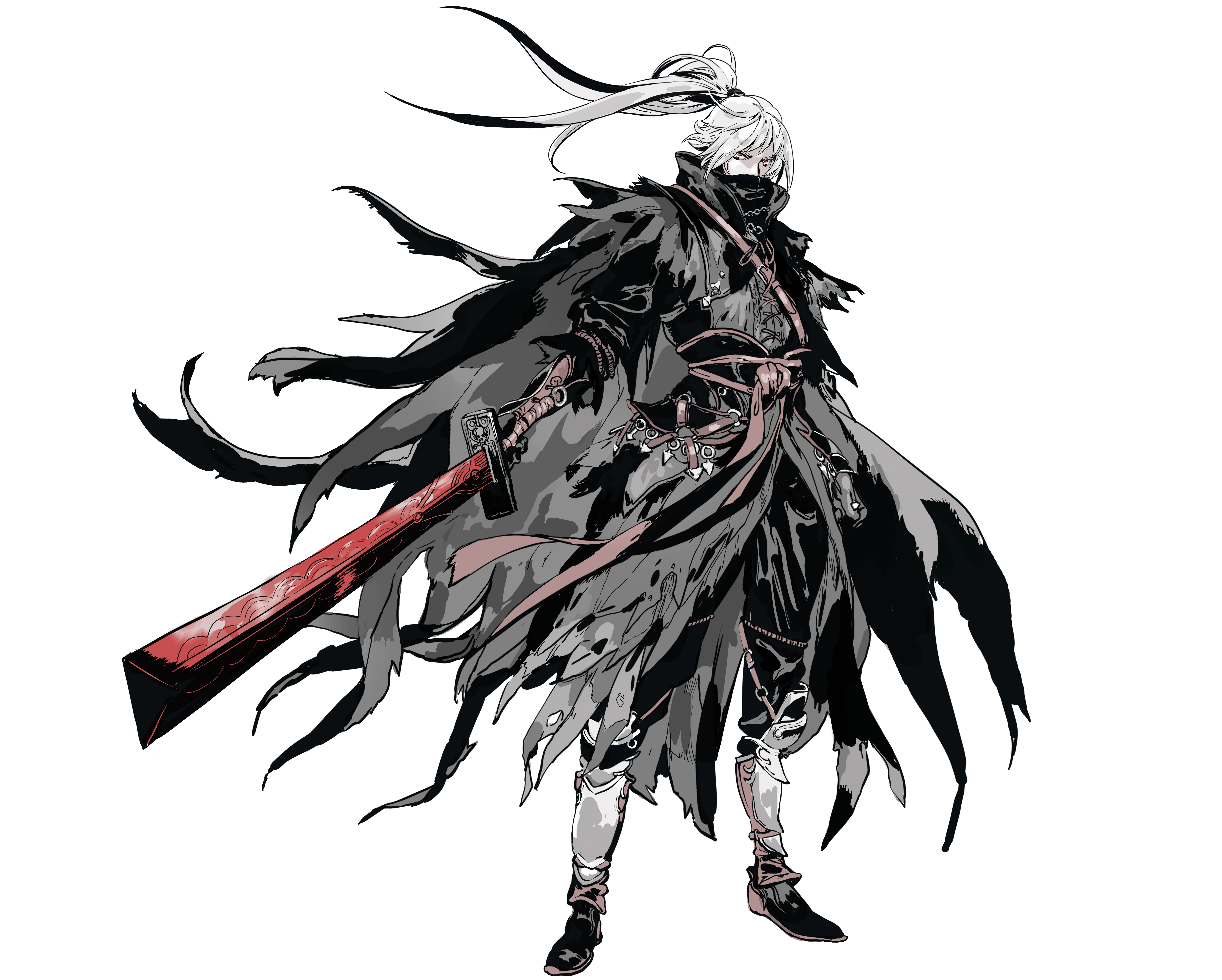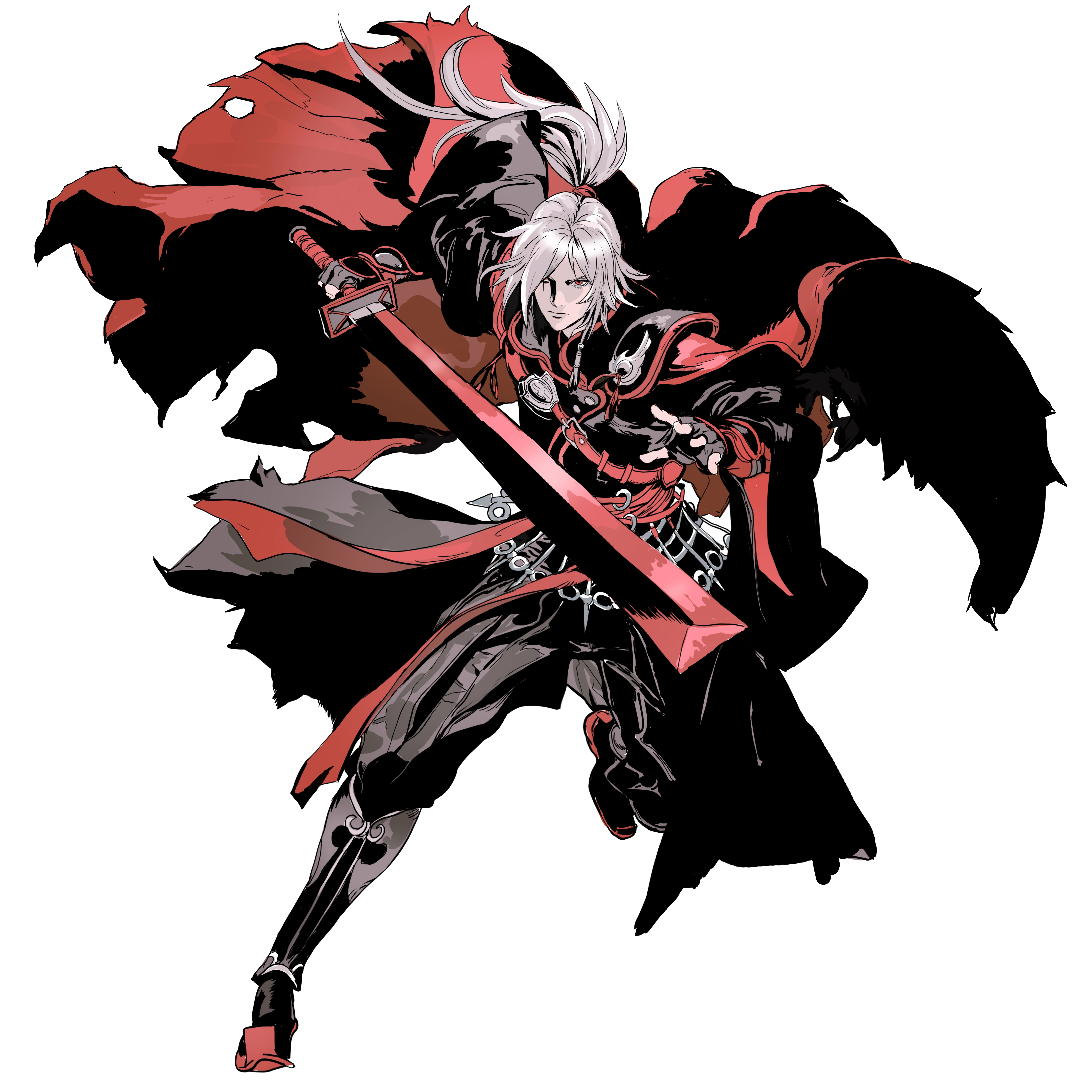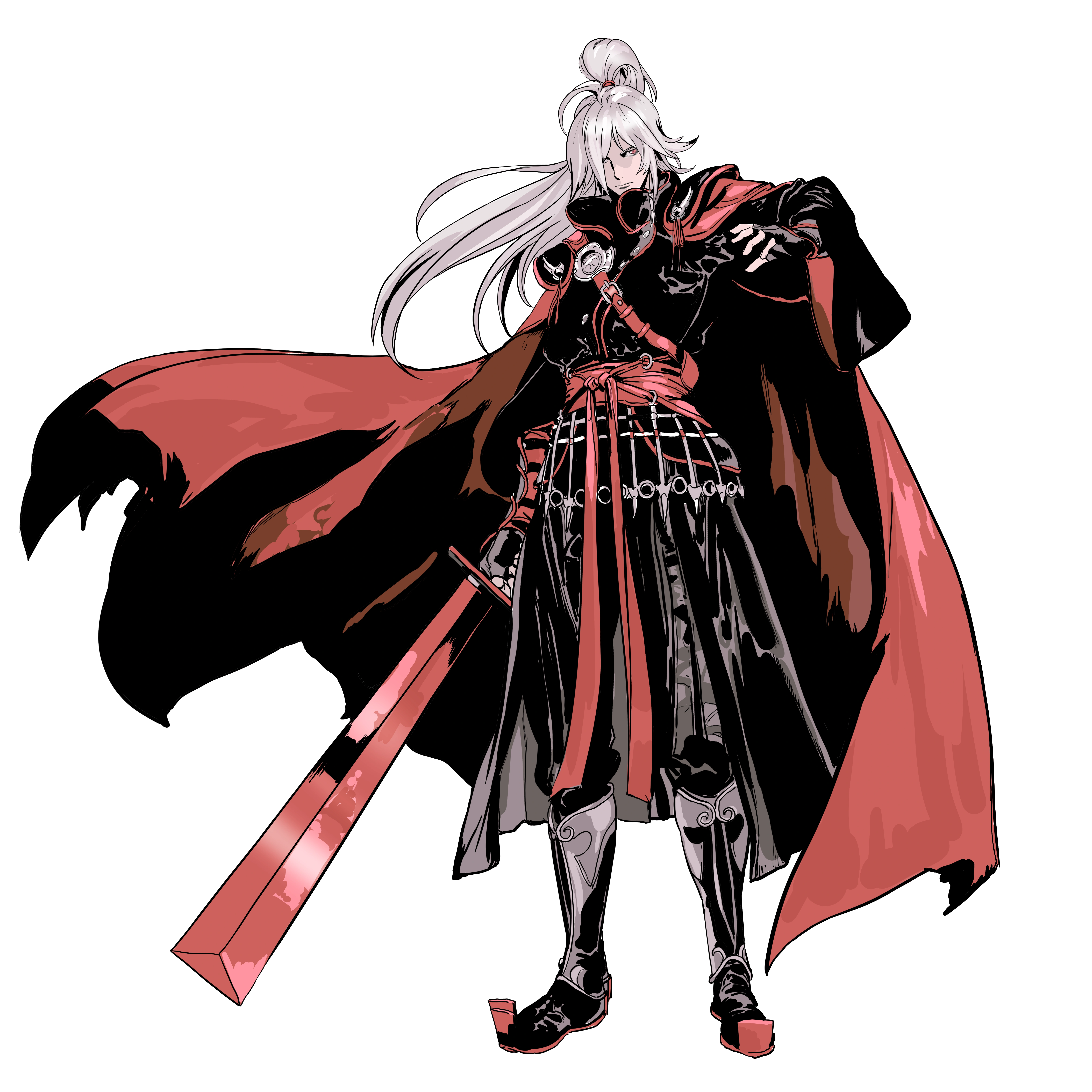 He has a tall, well built body and long white hair kept in a messy ponytail. Soul wears clothing of a grey and red palette with individual pieces of armor and a large cloak covering most his frame.