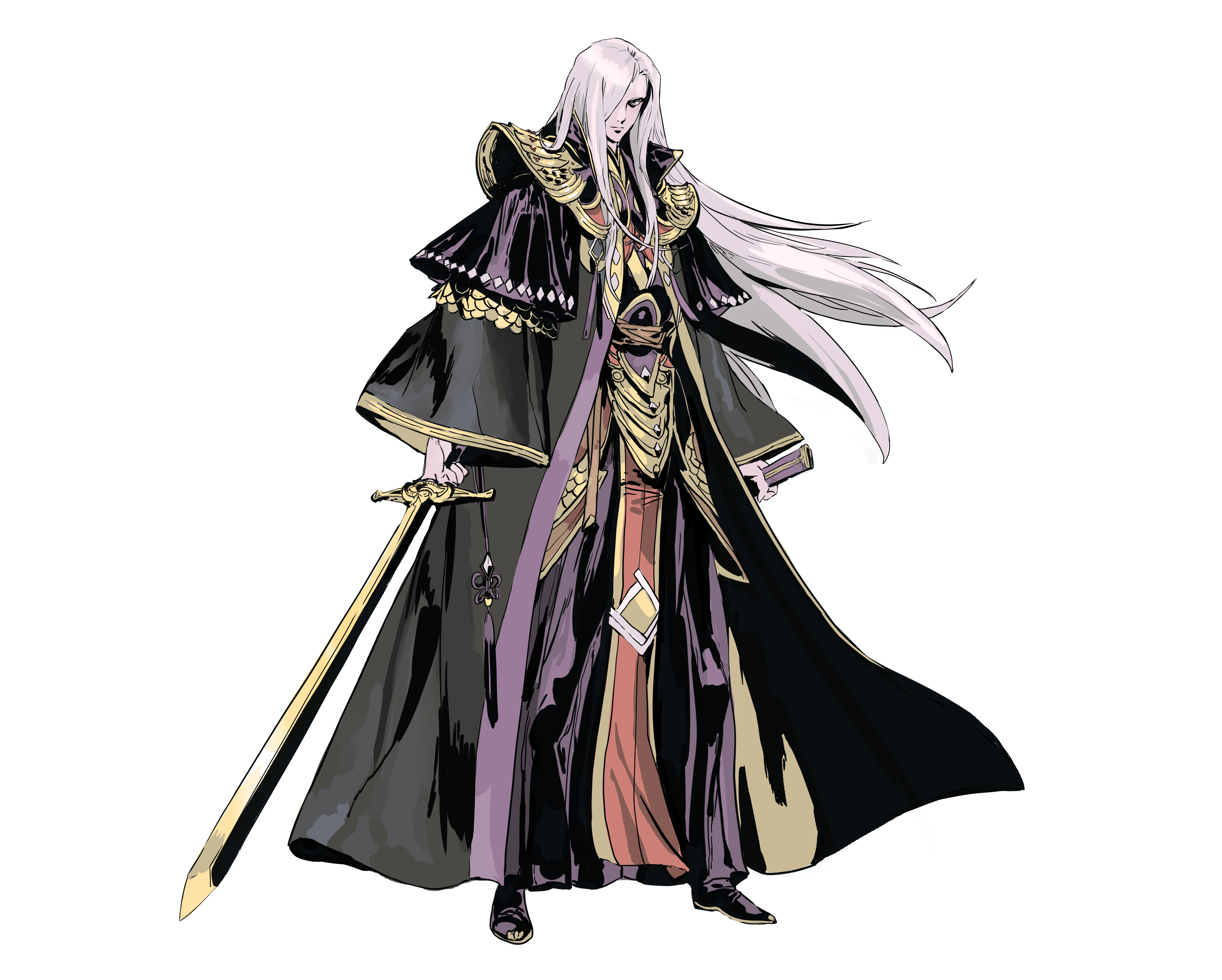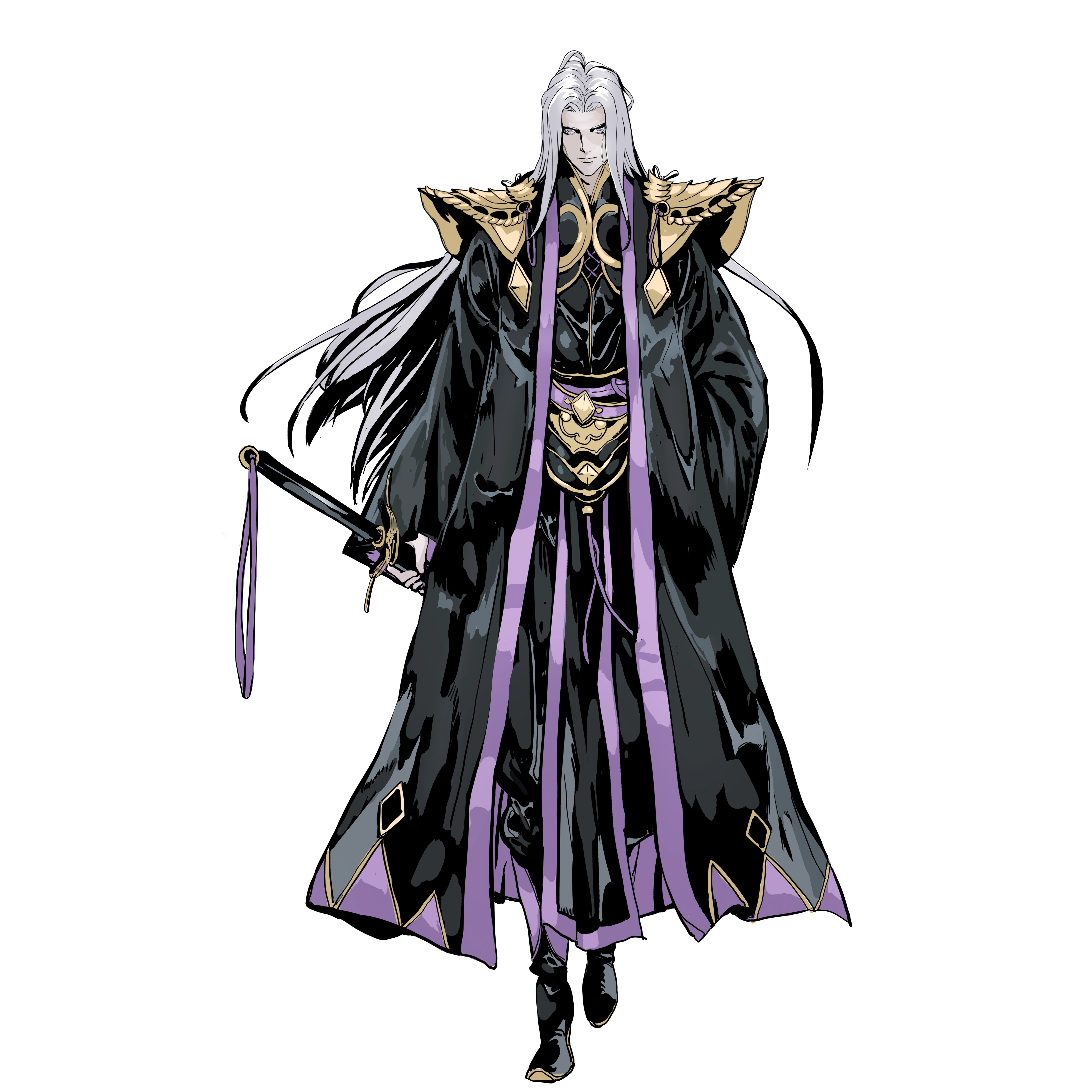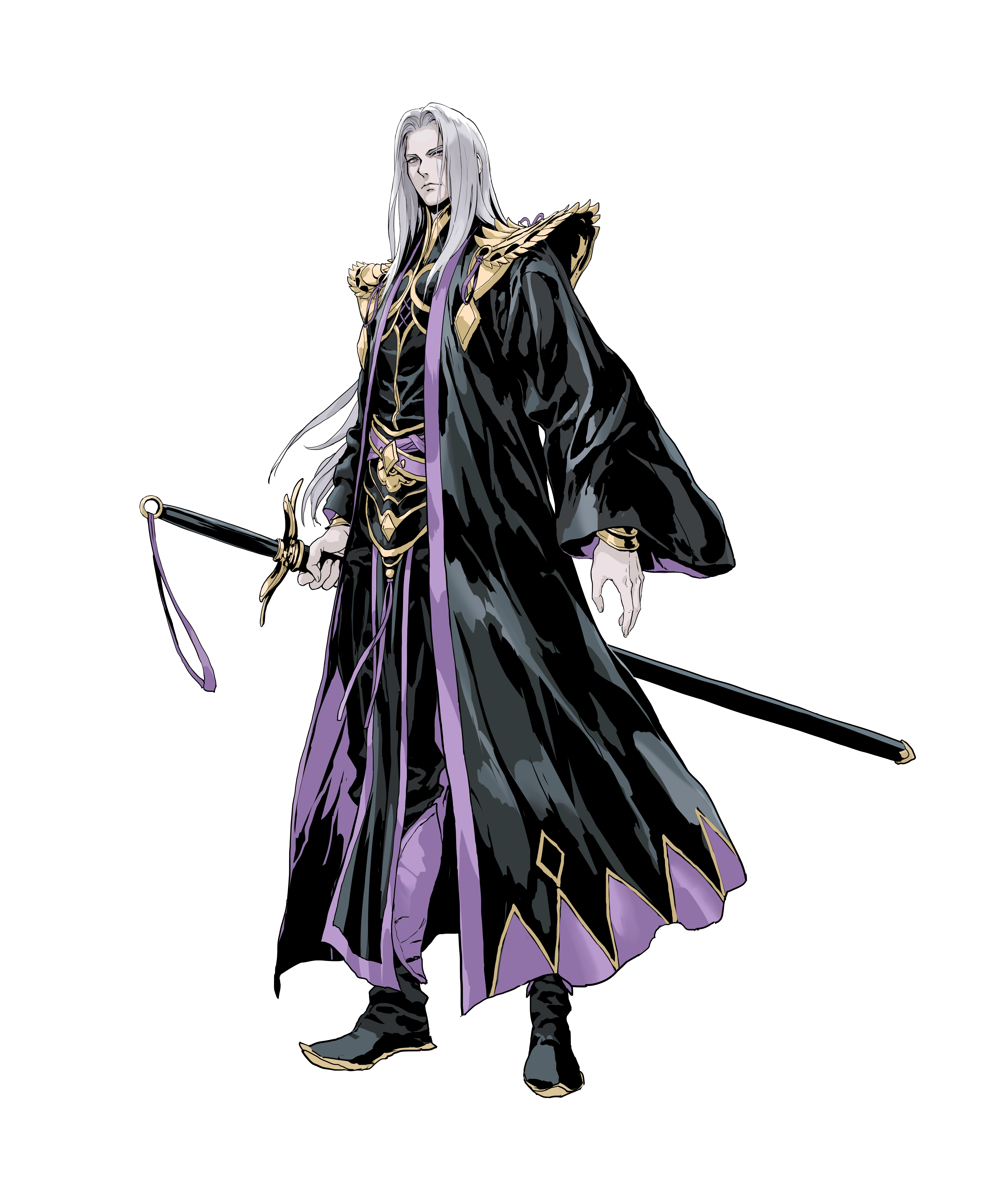 He has a slender figure, broad shoulders and thin waist, snow-white hair, pale complexion, handsome and masculine. Wearing black clothes and a purple robe trimmed with gold, he looked extraordinarily luxurious.